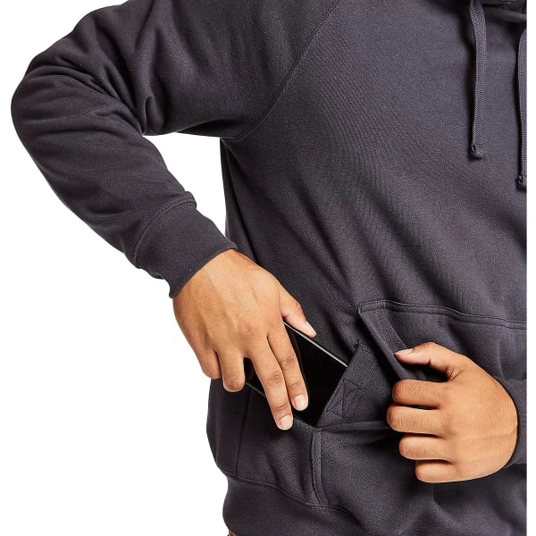 You can handle any outdoor challenge in this men’s fleece pullover hoodie. It is made from rugged heavyweight fabric that is durable, warm, and comfortable. Ribbed knit cuffs keep the cold out and the adjustable hood offers added coverage. Warm your hands or store items in the kangaroo pocket with an internal hidden pocket for your cell phone.
